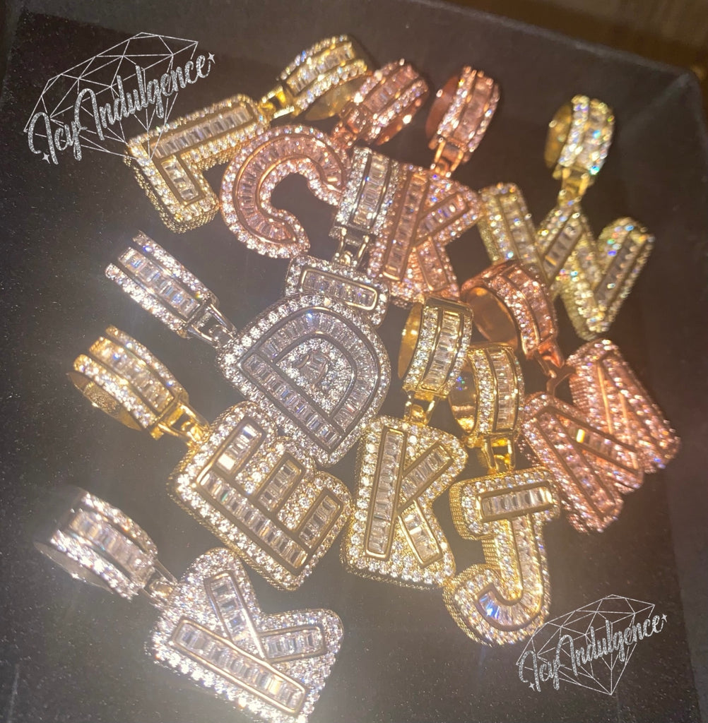 Small AAA CZ Baguette Initial Letter Pendant with stainless steel rope chain.